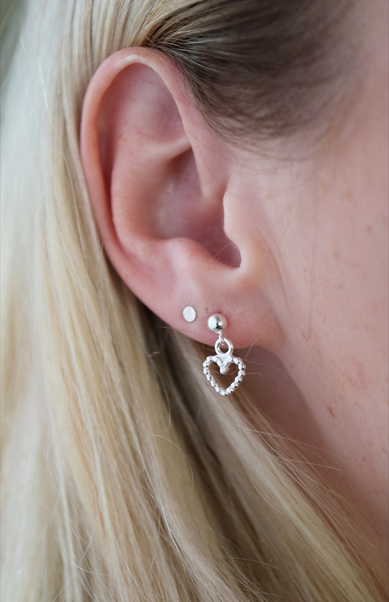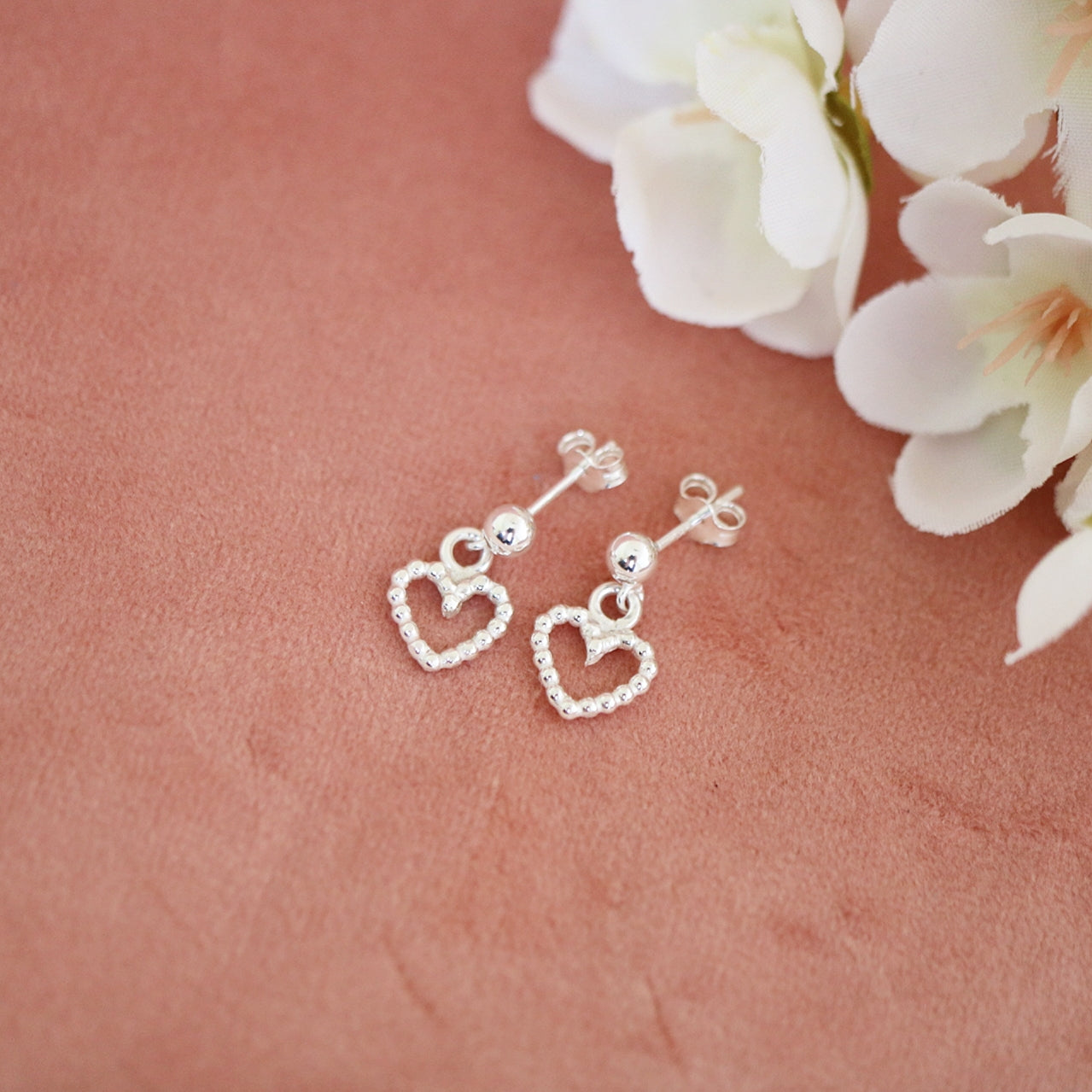 Søte små øredobber i sølv med hengende hjerter i kuletråd.