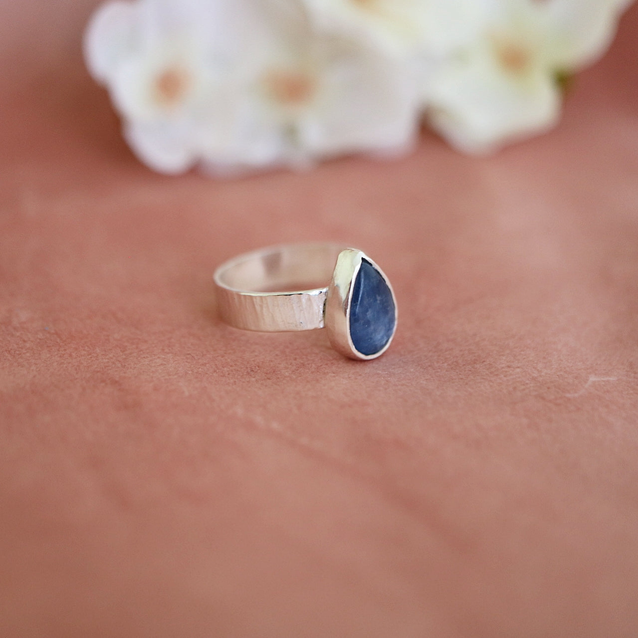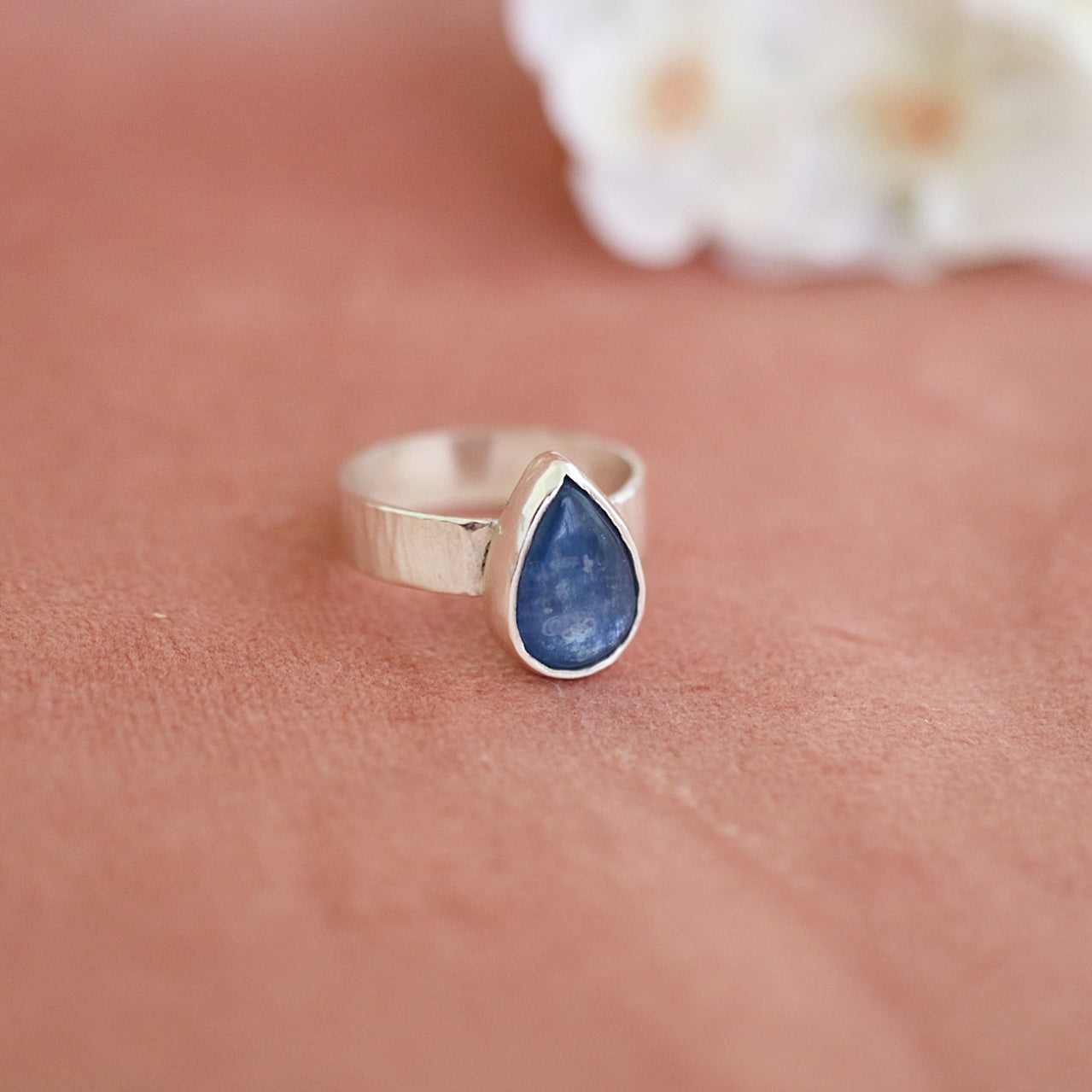 Steinen er en dråpeformet kyanitt med nydelig dyp blåfarge.